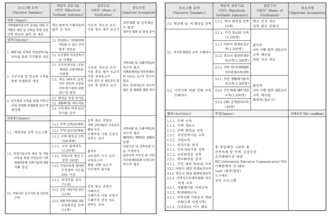 ④ 건축된 주택에서 영구 거주할 의지, ⑤ 정부로부터의 설계승인 절차 진행으로 나와있다. 하지만 수혜자 선정 필수 조건에 기후변화 취약성에 관련된 조건이 부재하며 아쉬움이 남는다.