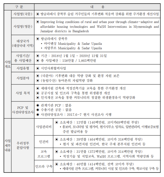 홍수, 사이클론, 산불 등 기후변화로 인한 자연재해가 많이 발생하는 방글라데시에서는 이로 인한 난민이 이주민의 약 26%를 차지할 만큼 당국의 큰 당면과제로 다뤄지고 있다고 한다. 그리고 이주민들의 약 31.5%는 빈곤선 이하의 가구소득으로 생활하고 있다. 사업지역으로 선정된 마이멘싱과 자말푸르 지역 또한 홍수, 사이클론 등 기부변화로 인한 자연재해가 빈번하게 발생되는 지역으로 적절한 주거환경을 갖추지 못한 슬럼거주 빈민들은 재해피해에 잘 대응하지 못하는 취약계층이다. 주거환경뿐만 아니라 식수 및 위생환경이 열악하여 이러한 상황을 개선하기 위해 시민사회협력사업으로 코이카와 해비타트는 아래의 사업을 진행하기로 정하였다.
